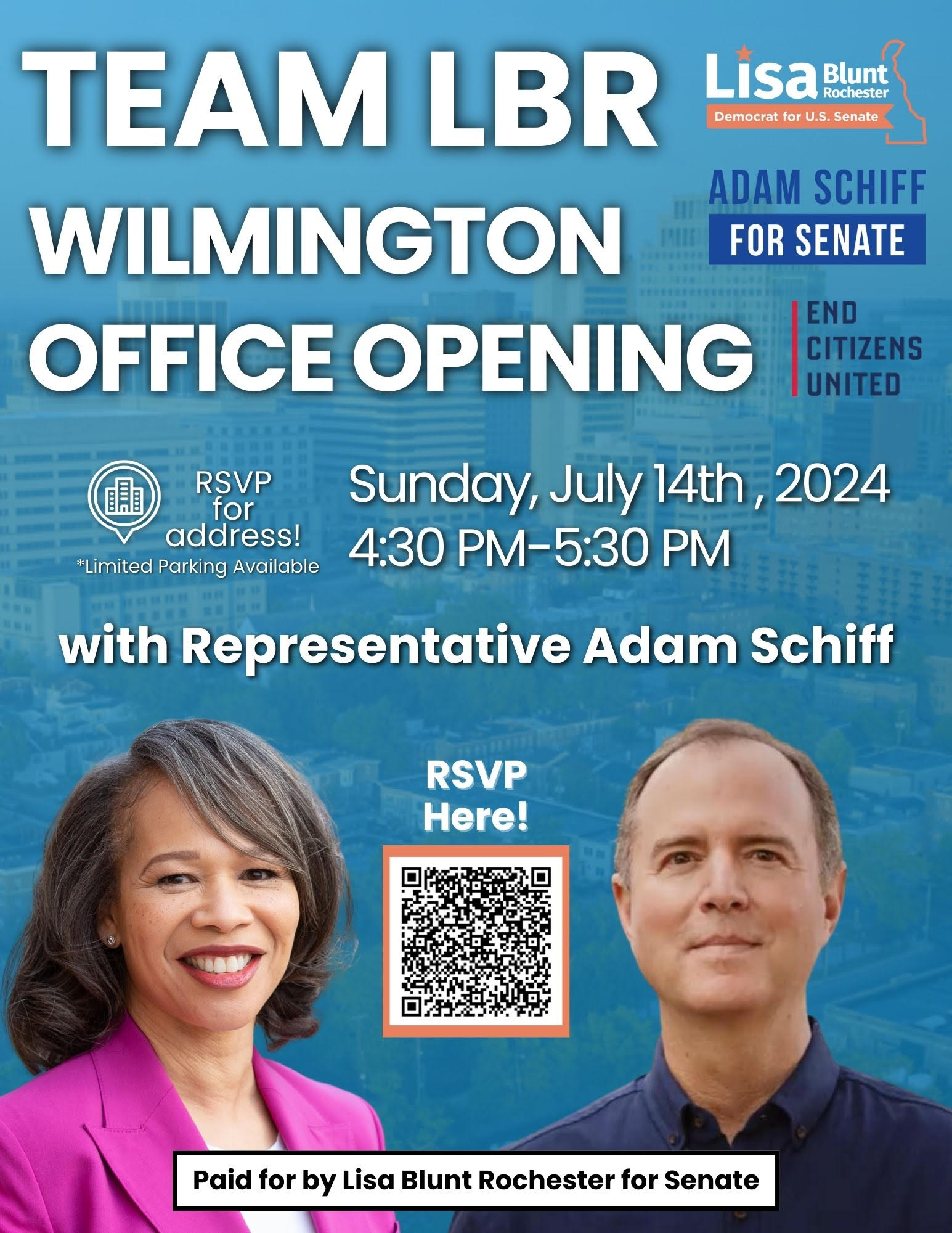 Join Representative Lisa Blunt Rochester and Representative Adam Schiff for the Team LBR for Senate Wilmington Office Opening! Details and RSVP information can be found below.